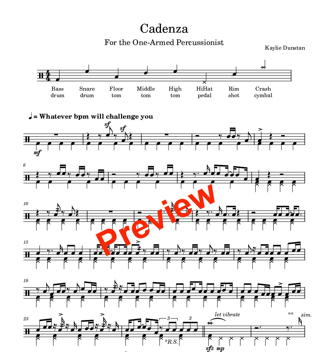 Accidents happen… But losing the functionality of a hand or arm shouldn’t stop you from playing drums. Students at various levels can be challenged by choosing their own tempo. The cymbal section is also ad lib. i.e. the performer can improvise on their own between the cymbals or adhere to the notated rhythms while experimenting with the orchestration of the cymbals. The final section is ideally faster than primo tempo, but would be most effective if the performer remains in control without appearing frantic.