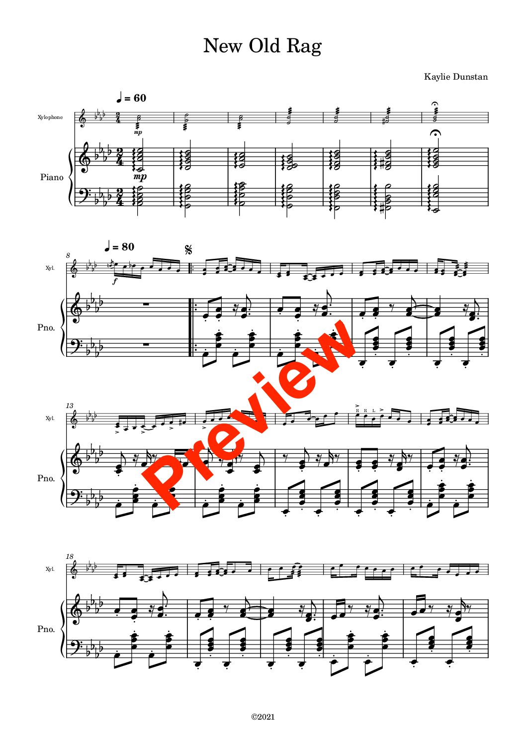 This is a throw-back to the renowned ragtime style, first coming onto the music scene in the late 1800’s. The most famous composer being Scott Joplin and later in the 1930’s, popularised by the Green Brothers on xylophone. The solo part employs quintessential ragtime xylophone figures and plenty of syncopated accents. The off-beat chordal emphasis of the piano accompaniment provides that uplifting ‘oompah’ feel. Suitable for grade 4 standard.