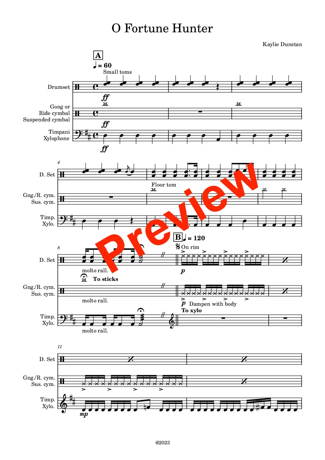 The last ensemble composition in Percussion Masters Beginner Group, ‘O Fortune Hunter’ pays homage to the adored ‘O Fortuna’ opening theme. The excitement builds through driving semiquavers and rhythmic modulation. Some artistic license is given to the performers in how they transition into the recapitulation.