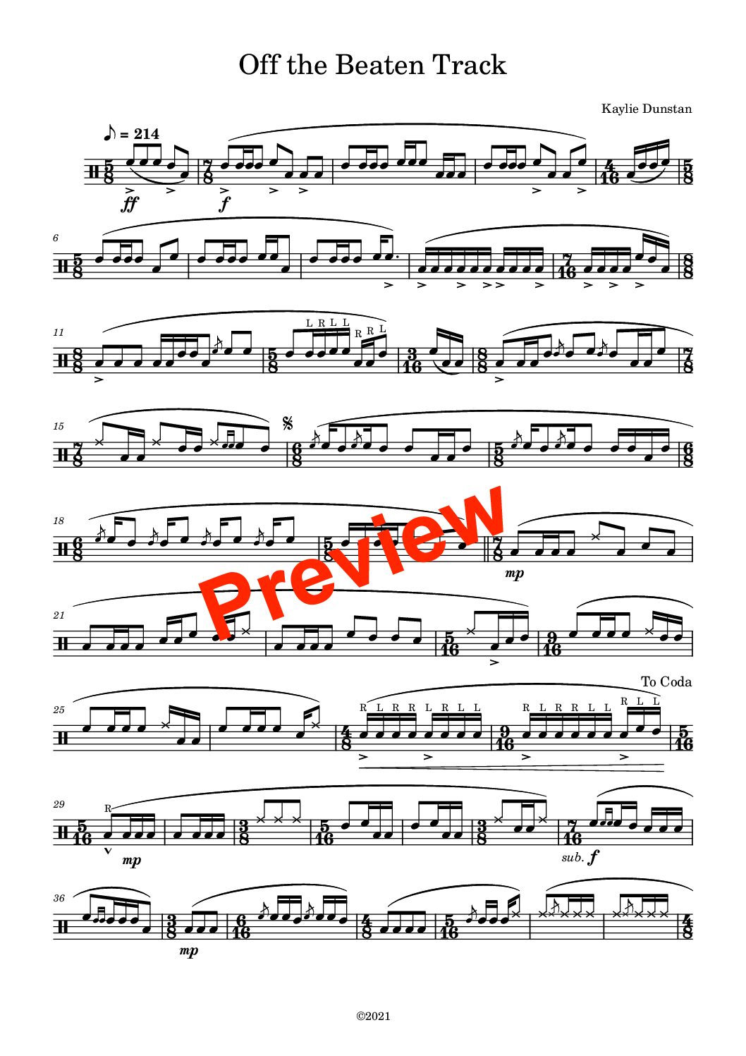 Taken from the work ‘Trip Hazard‘, ‘Off the Beaten Track’ is the drumset realisation of the same material. Adding melody to rhythm, this sequel is a fitting rounding off to the snare drum solo version. Someone once told me to imagine my snare drum notes being scored across the other instruments in a symphony orchestra. The result is a fascinating reinvention of the sound, transforming what the listener hears based on what is imagined by the performer. Revisiting ‘Trip Hazard’ after this piece could very well have the same effect.